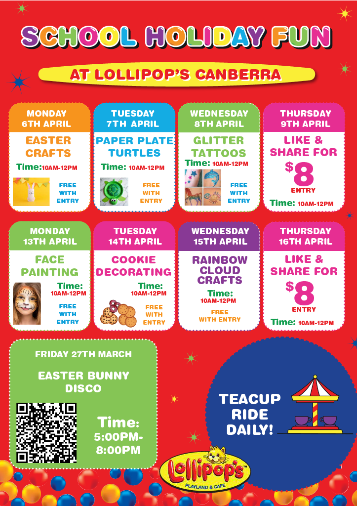 These School Holidays Lollipops Canberra has you sorted! From Crafts, to Discos and more!